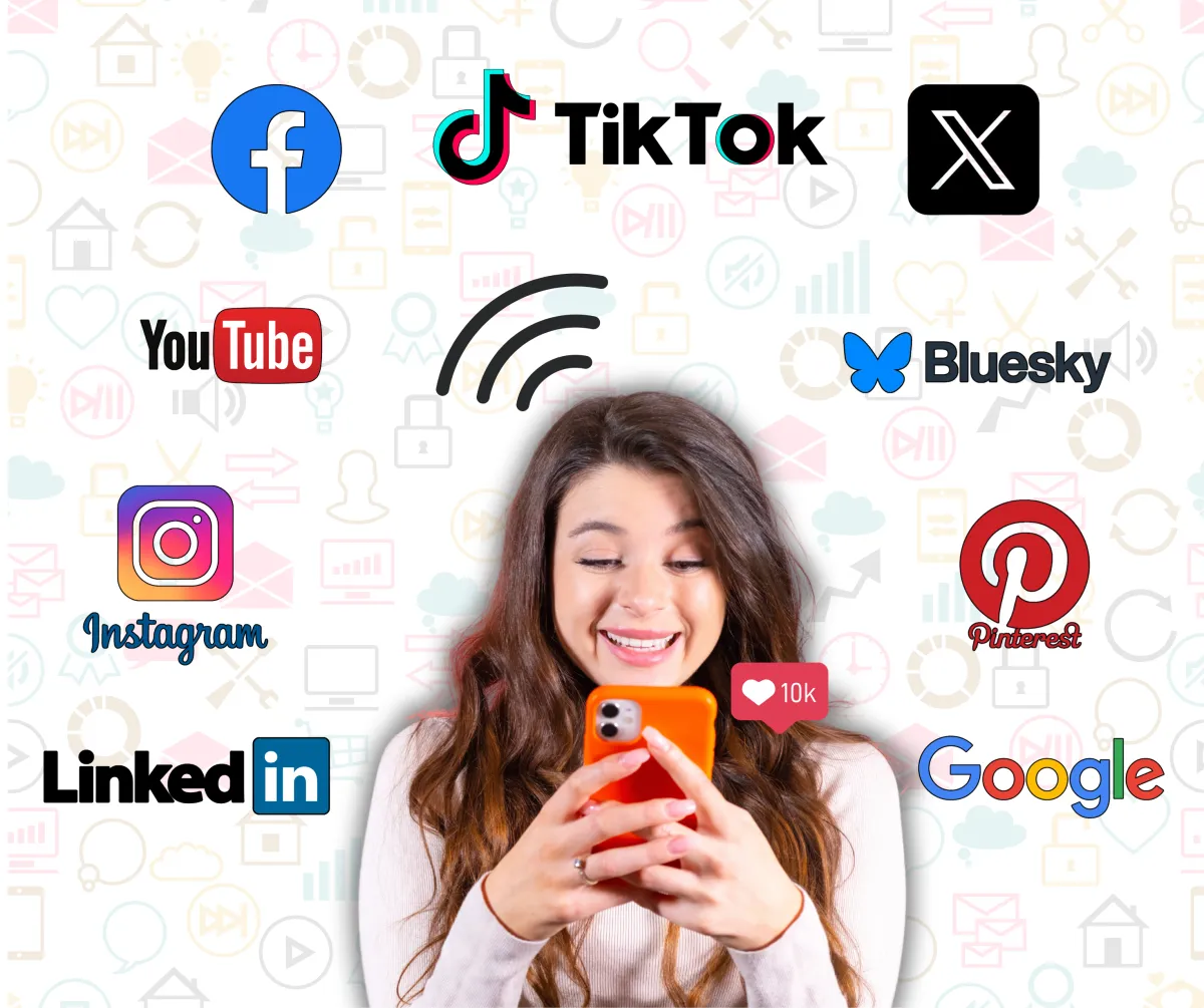 All major platforms (Facebook/Instagram, LinkedIn, TikTok, X, Bluesky, and etc...)
